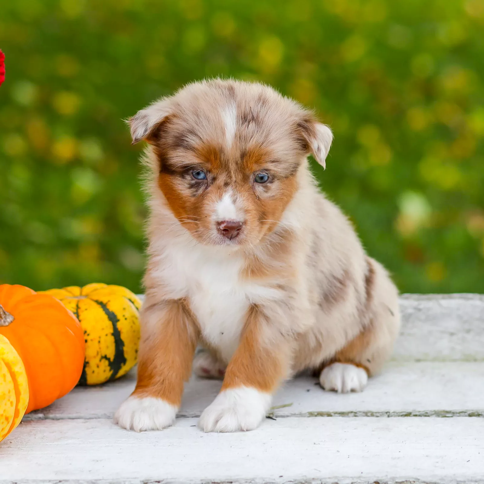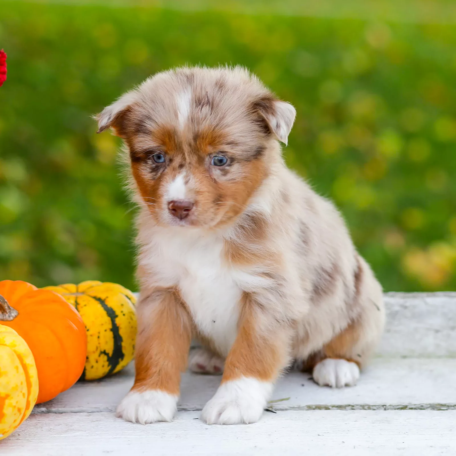 Meet George, a striking Red Merle male Mini Australian Shepherd with a heart as warm as his copper-toned coat. His bright blue eyes sparkle with curiosity and intelligence, always eager for the next adventure. George’s playful spirit and loyal nature make him the perfect companion for both work and play. Whether he’s herding, hiking, or cuddling on the couch, this charming little Aussie wins hearts wherever he goes with his energy and affection.